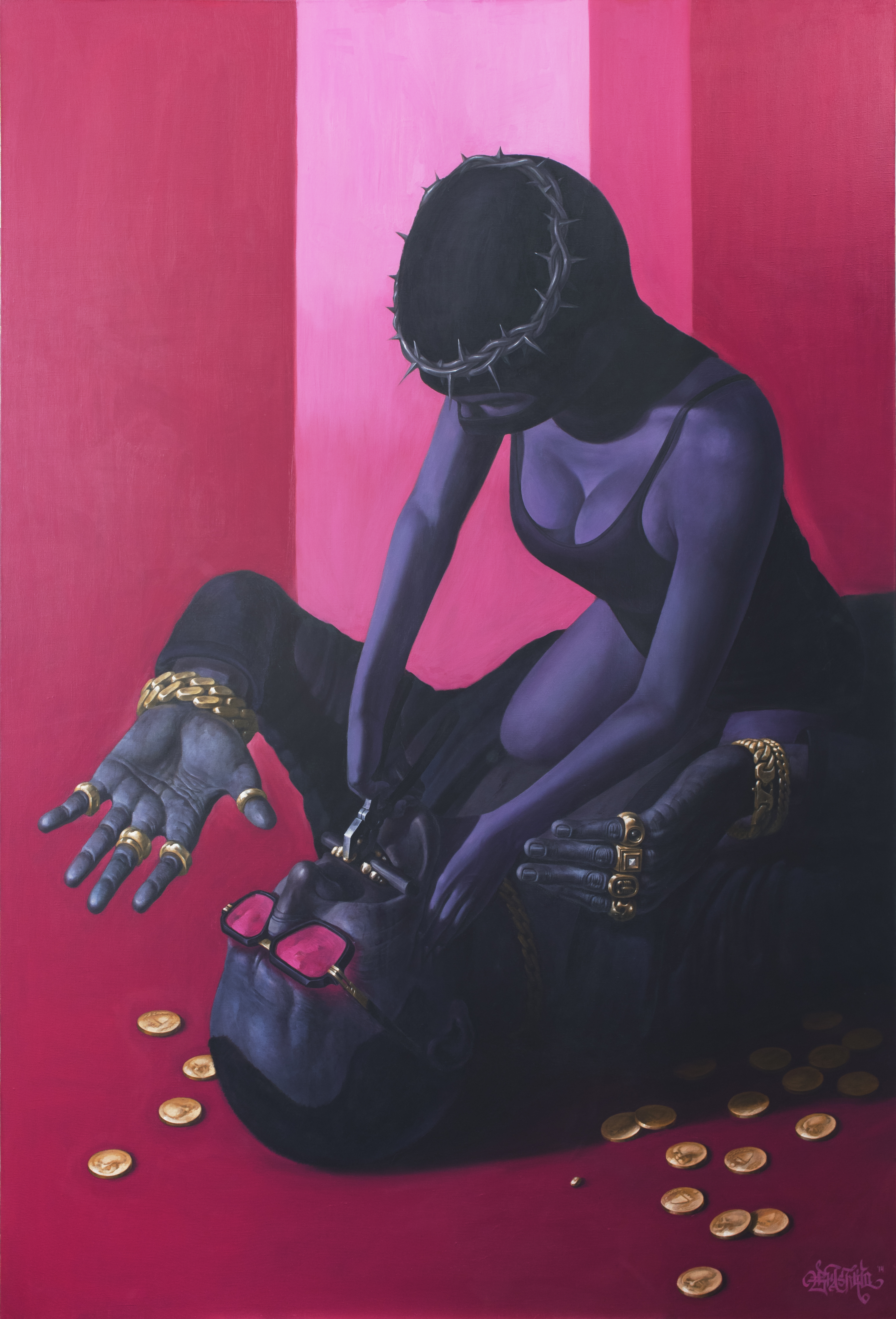 Alexander Brashkin's street art revolved around various demonic figures, but in his painting series the artist turns to different aspects of the human nature. Apart from the pointedly satirical undercurrent, Brashkin immerses the viewer in visions of a different reality in which violence, lust and the cult of pleasure coexist quite effortlessly. The artist's protagonist is a dreamer drifting in a stream of irrational images, at the same time controlling what he sees, thus being omnipotent. Alexander Brashkin offers us a visionary experience, revealing amid the garbage heaps of impressions left by fictitious popular culture some authentic and truly powerful sensations, wild and dark in nature.