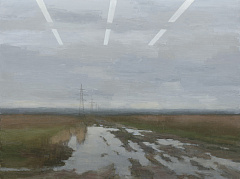 Otdelnov’s preferred genre is industrial landscape, with a particular focus on post-Soviet industrial architecture. Experimenting with light and shadow, the artist depicts large desolate expanses featuring building façades, factory chimneys, and power lines against the backdrop of an endless monochrome landscape. Using painting, installation, and other media, he reconstructs long-forgotten stories and repurposes familiar imagery, initiating a dialogue between his own experiences and a wider social and political context.